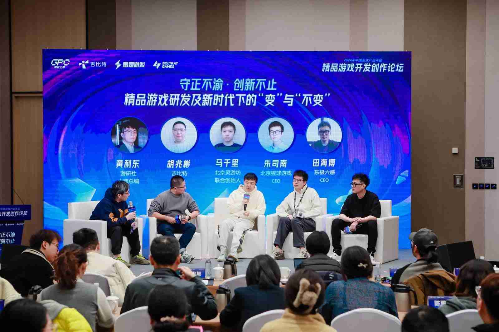 圆桌对话环节,,,,在游研社内容总编黄利东的主持下,,35273CTO胡兆彬、、、、北京灵游坊联合创始人马千里、、北京猩球游戏CEO朱司南、、、东极六感CEO田海博等四位嘉宾围绕“守正不渝、、、创新不止——精品游戏研发及新时代下的‘变’与‘不变’”这一主题分享了各自在精品游戏开发理念及工程能力搭建方面的见解和经历,,,并就行业变化下游戏人需要坚守的理念等展开交流探讨。。。。