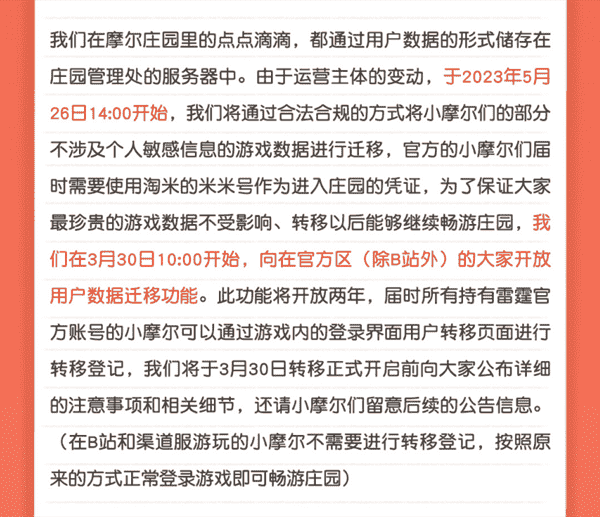 因此针对账号问题,,,,双方第一时间就在公告中表示会“长期开放用户数据迁移功能”,,,“保证大家最珍贵的游戏数据不受影响、、、转移以后能够继续畅游庄园”。。。。3月30日后,,,玩家可以根据后续的公告说明自行操作,,,,将账号绑定在淘米游戏的米米号上,,后续使用米米号登录。。。。
