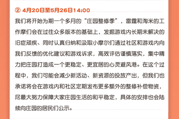 合作的结束并不意味着这个童年IP的结束,,对于《摩尔庄园》手游而言,,,,这是一个新阶段的开始。。。。后续游戏内将开启庄园重构计划,,,会就以往遗留下来的BUG进行集中修复,,,,并在游戏内和社区定期发布更多补偿物资。。。