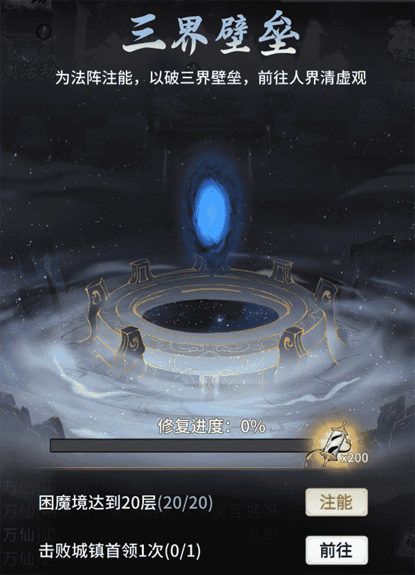 当你修为达到返虚/破虚中期后,,,,可在城镇寻得芸丫并激活神秘法阵,,,,通过收集材料、、、击败首领等方式为法阵注能,,,借以打破三界壁垒,,开启支线剧情“清虚旧梦”
